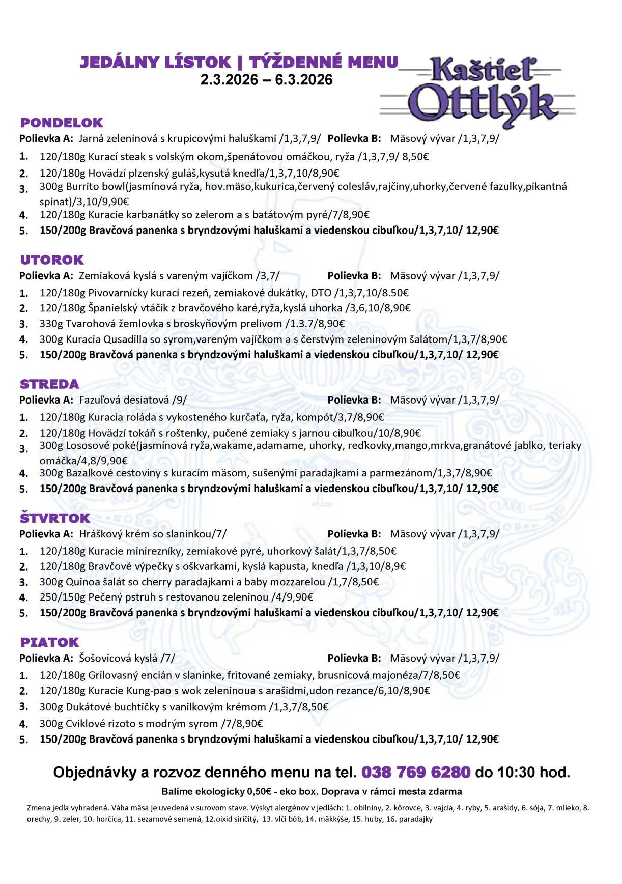 Jedálny lístok okrem stálej ponuky obsahuje každý pracovný deň biznis menu a počas sezony, sezonny jedálny lístok podľa obdobia a toho čo nám krajina a region poskytuje. Ako napríklad v tomto ročnom období je u nás v ponuke Tekvicová polievka.